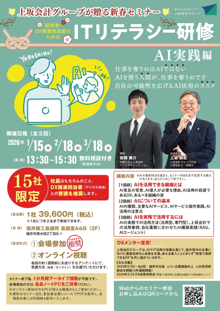 JAN152026 1/15・2/18・3/18(全3回)経営者・DX推進担当者のためのITリテラシー研修 AI実践編 上坂会計グループが贈る新春セミナー 経営者・DX推進担当者のためのITリテラシー研修 AI実践編 15社限定! 社長はもちろんのこと、DV推進担当者(デジタル担当)との受講を推奨します。 開催日程(全3回)2026年 1/15(木)、02/18(水)、3/18(水) 参加費1社 39,600円 (税込) ※1社につき2名まで参加できます。 会場福井商工会議所 会議室A&B (2F) 福井市西木田2丁目8-1 参加形式①会場参加(推奨) ②オンライン視聴 各回の約1週間前にお送りするアンケートにて、受講方法 (会場/オンライン) をお選びいただけます。 各回13:30~15:30 無料相談付き(希望者のみ) セミナー終了後、1か月間アーカイブ視聴が可能です。 会場参加の方は、各自ノートPCをご持参ください。 ※オンライン参加の方もPCが使える環境のもとご参加ください。 ※資料はセミナー当日、参加者全員にメールでPDFを配布し、会場参加者には印刷物も配布いたします。 講義内容 ※AIの最新時流を踏まえ、セミナー内容を若干変更する場合があります。あらかじめご了承下さい。 【1回目】 AIを活用できる組織とは AI普及の背景、AI導入が必要な理由、AI活用の前提であるDX、あるべき組織の姿 【2回目】 AIについての基本 AIの種類、主要なAIサービス、AIサービス操作実践、AI活用の注意点 【3回目】 AIを実務で活用するには AIの実務での活用方法 (汎用型、専門型)、上坂会計での活用事例、自社業務に合わせたAI構築実践 (RAG、AIエージェント) 講師 笹岡 勇介 税理士法人上坂会計、データサイエンティスト 金沢大学経済学部卒業後、2010年(税)上坂会計に入社 会計・税務申告業務に従事。その一方で、2022年応用情報技術者に合格し、データサイエンティストとして社内の業務効率化に向けたシステム開発業務も行う。また、RPA、ローコードの開発経験を持ち、中小企業が実践できるシステム化の支援・指導と、セミナー講師も務めている。令和3年度~令和7年度の福井市主催の人財育成研修会では、講師・企業個別指導を担当。 全体統括 上坂 朋宏 上坂会計グループ代表、鳥瞰塾塾長、公認会計士/税理士 同志社大学商学部卒業後、公認会計士の試験に合格。太田昭和監査法人(現EY 新日本有限責任監査法人)を経て上坂公認会計士事務所を開業し、1991年(株)上坂経営センター設立。現在7社からなる上坂会計グループの代表。「経営とは人間学である」をモットーに多くの経営者の指導にあたり、経営塾である鳥瞰塾、育志塾を主宰。 DXメンター宣言! 上坂会計グループは、AIやIT活用の啓蒙を通じて、福井県内の企業に向けた業務効率化と成長を支援。単なる導入にとどまらず“現場で実用できるDX”を共に進めていきます。 【主な活動】 2025年9/30~全6回 福井市主催 ふくい企業価値向上 人材育成研 修会を開催(5年連続開催) 2026年3/25 DX成果発表会 (予定) ※福井商工会議所会議室での参加無料イベント お申し込み こんな課題を抱える企業の皆様へ ChatGPTをはじめ幾つかの生成AIを自分でも使うようになったものの、自社の業務に活かすところまで出来ていない社長とデジタル担当のスタッフ。 参加するとどうなる? 2026年、中小企業はこのAIを押さえておくべきといったAIの時流がわかる どうやって自社にAIを導入できるかイメージがつく 当研修の強み 具体的かつ実践的!! ●業務に導入する際の手順や考え方まで伝授 ●少人数参加型セミナーなので全員理解までサポート ●導入事例を解説することで、自社に置き換えてイメージ 3回の研修を受講後 「うちは、こういう方針でDX・AI導入を進めよう!!」と、確信を持って決定することができる! その結果、 ●人手不足の解消 ●業務効率化実現 ●事業継続の確信 2026年、まずはAIから いま、どこも人手不足なので、社内のDX導入を取り組まないとこの先企業として生き残っていくことが難しくなります。しかし、毎日のように新しい生成AIサービスが誕生し情報が溢れる世の中において、どこから手をつけたら良いのかわからないというのもこれまた事実です。 そこで、まずはDXやAIの時流を知り、使い方を学び、事業にどう活かすかをイメージすることからこの研修で始めましょう。 弊所は会計事務所でありながら、デジタルが世に普及したばかりの30年前から社内での導入を積極的におこない続け、今では社員のほぼ全員がITパスポートを取得するほど社内にデジタルやDXが浸透しています。その中でも、今回講師を務める笹岡勇介は、データサイエンティストとして上坂会計DX化の中心人物として活躍し、今では、取引先のDX化支援も多数実績があります。 そんな上坂会計で培ってきた事例を含めて研修でもわかりやすく解説していきますので、どうぞ、AIやDXを社内に導入するキッカケになる学びを、2026年の初頭から取り組んでみてください。 尚、この研修は社長や経営幹部と、DX推進担当者と共に受講することを推奨します。 上坂 朋宏 その他、ご質問などありましたら、気軽にお問