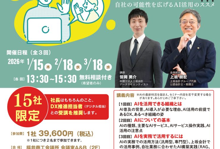 FEB102021 2/10(水)鳥瞰塾ZERO 2021 日時2021年2月10日(水)13:00〜17:00(受付12:30より) 会場<会場受講> 福井商工会議所コンベンションホール地下1階(福井県福井市西木田2-8-1) TEL : 0776-33-8251 <オンライン受講> YouTube Live(ライブ配信) 受講料10,000円(税込)/おひとり様 定員<会場受講>30名 <オンライン受講>無制限 お申し込み 鳥瞰塾ZEROとは、塾長である上坂朋宏が、“時流予測”と“経営の基礎と原則”を融合させ、その年の重点施策を伝える年初開催の恒例セミナーです。 これまで、9年連続満員御礼。昨年も参加者は130名を超え、上坂会計グループのセミナーの中でも一番の動員数となる大人気セミナーとなっております。 今回の鳥瞰塾ZEROでは「アフターコロナに企業として生き残るために必要となる2021年の経営時流」についてお話する予定です。 また、今回は会場での受講とオンラインでの受講をお選びいただけます。 以下の項目に当てはまる方は鳥瞰塾ZEROにご参加ください アフターコロナにこそ進化成長したい方 2021年の経営をより良くしたい方 いま経営をどうするか判断に迷っている方 今年の参加方法は2つ ①会場での受講 先着30名限定! コロナ対策も万全 【会場】 福井商工会議所コンベンションホール(地下1階) 福井市西木田2丁目8-1 ②オンラインでの受講 定員無限です! 開催方法 YouTubeLive 【オンラインセミナーとは?】インターネット上で開催されるセミナーのことです。会社やご自宅でパソコンやiPadのようなタブレット端末、スマホから簡単にセミナーが受講できます。 オンライン受講にあたり、以下の点をお守りください。 申込をされていない方の周りでの聴講は固く禁止させていただいております。 セミナー画面を撮影、録画、録音は固く禁止させていただいております。 オンライン受講を申し込み後、会場受講への変更はお受けすることはできません。 セミナー終了後、約2週間アーカイブ視聴が可能です。当日都合が悪くて参加できない方も、是非お申込みください! 上坂会計グループでは、毎年多くのセミナーを開催してきましたが、新型コロナウイルスの影響で2020年3月以降、会場での開催が困難となり、延期やセミナー内容の見直しを余儀なくされました。しかし、そんな時期でも“コロナ対策 緊急セミナー”をオンラインにて開催し、セミナー開催の在り方を模索し続けました。 2021年の鳥瞰塾ZEROは、会場受講(30名様限定)とオンライン受講から選ぶことが可能です。今まで、遠方のため参加できなかった方や外出が難しいという方も是非オンラインでご参加ください。私は会場で講義しますので、ライブ感を味わいたいという方は是非会場にお越しください。私はできるならば参加される皆さん全員にお会いしたいと思っています!! 世界中が先行き不透明で、人々は日々不安の中に生きていますが、今回の鳥瞰塾ZEROではこんな時代に企業の経営者や主体性ある仕事人は「アフターコロナに何を考え」「どんな行動を取るべきか?」そのような話をする予定です。世界情勢や時流など調査を重ね、セミナー当日は最新情報を皆さんに提供するつもりです。 毎年、このセミナーで話をすることがとても楽しみなのですが、今回の鳥瞰塾ZEROも、皆さんの不安を少しでも取り除けるよう、しっかりとお話しさせていただきますので、是非、ご参加ください。きっと満足してもらえると思います。 講師 上坂 朋宏 上坂会計グループ代表、鳥瞰塾塾長、公認会計士/税理士 同志社大学商学部卒業後、公認会計士の試験に合格。太田昭和監査法人(現 新日本監査法人)を経て上坂公認会計士事務所を開業し、1991年(株)上坂経営センターを設立。現在6社からなる上坂会計グループの代表。「経営は人間学である」をモットーに多くの経営者の指導にあたり、経営塾である鳥瞰塾、育志塾を主宰。 お申し込み